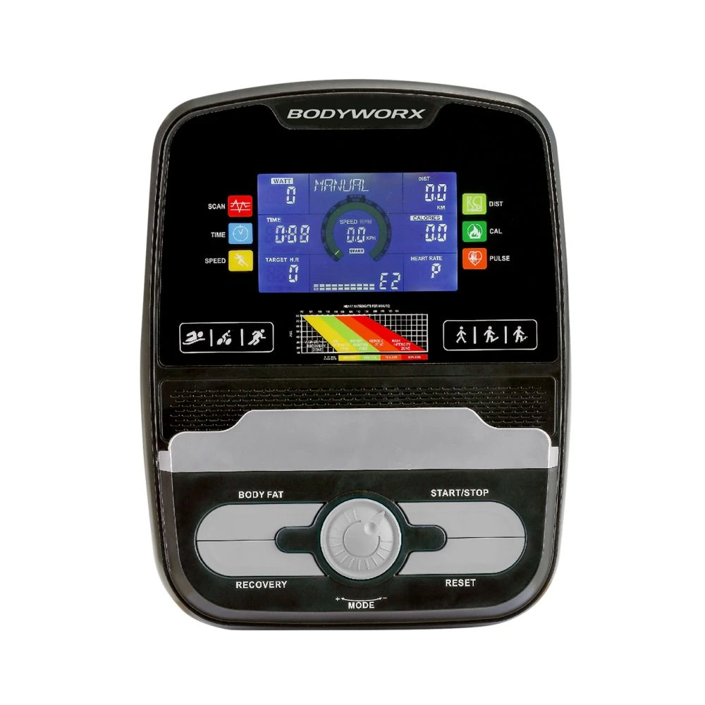 Console Display: 5” backlit LCD Screen which shows Time, Speed, Distance, Estimated Calorie Burn, Watt, Bodyfat, Pulse & Recovery